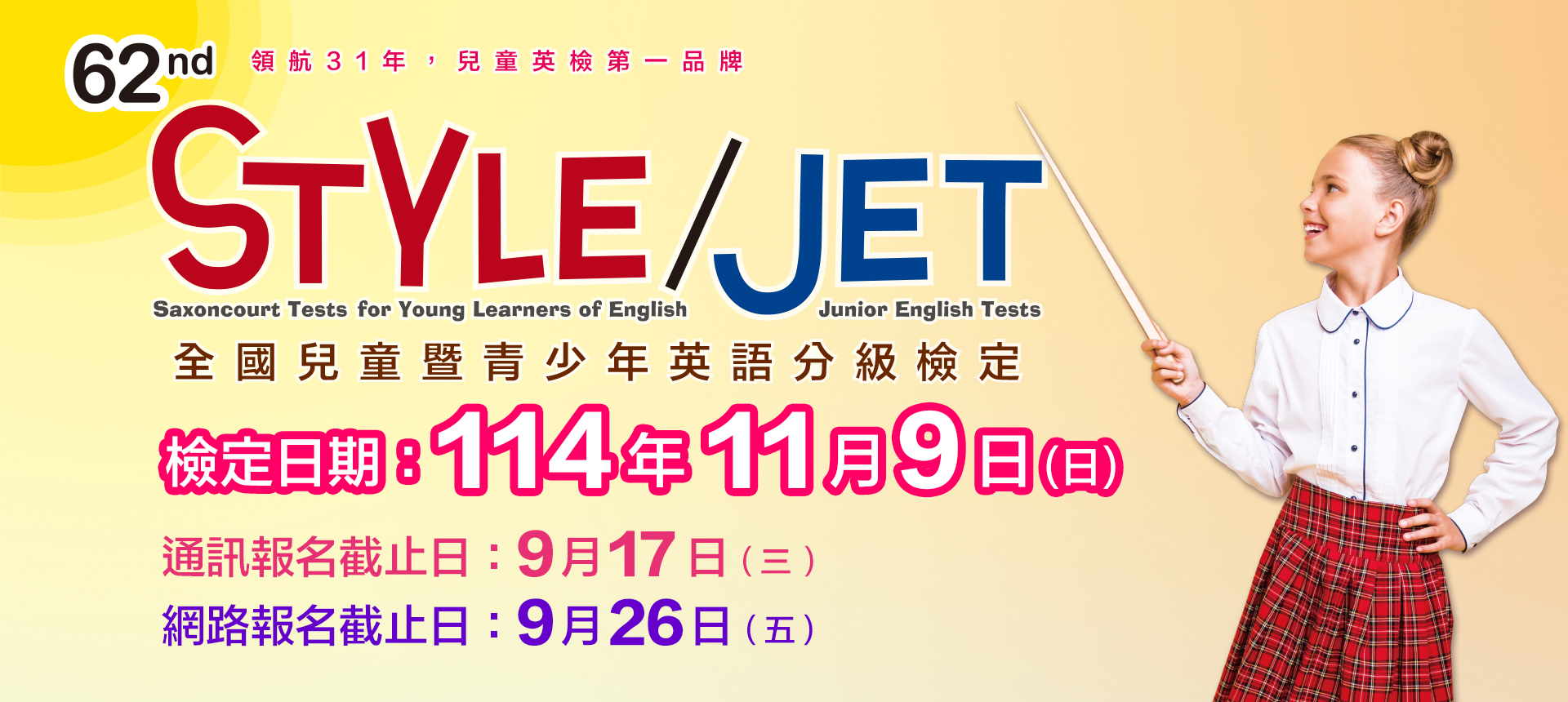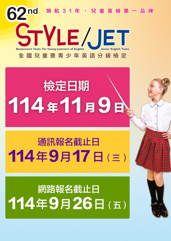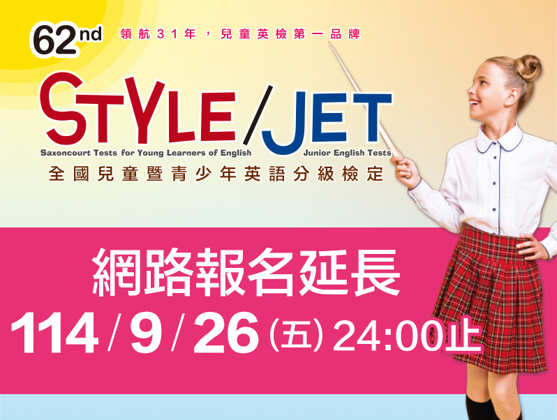 最新消息 2025-09-23 第62屆STYLE/JET檢定 延長報名至9/26 2025-01-14 STYLE/JET 線上測級數 Read more STYLE View 透視評量 2023-04-19 兒童英檢考什麼? 透視評量 2023-04-18 兒童英檢比一比 (下篇) 透視評量 2023-04-17 兒童英檢比一比 (上篇) 透視評量 2023-03-01 考英檢前的心理建設策略 Read more
