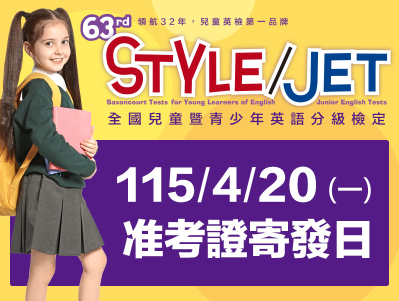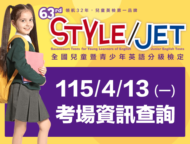 最新消息 2026-01-05 第63屆STYLE/JET檢定 1/5開放索取簡章 2025-01-14 STYLE/JET 線上測級數 Read more STYLE View 透視評量 2023-04-19 兒童英檢考什麼? 透視評量 2023-04-18 兒童英檢比一比 (下篇) 透視評量 2023-04-17 兒童英檢比一比 (上篇) 透視評量 2023-03-01 考英檢前的心理建設策略 Read more